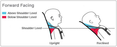 For a forward facing car seat, the straps need to come out of the seat at or above the child’s shoulders.